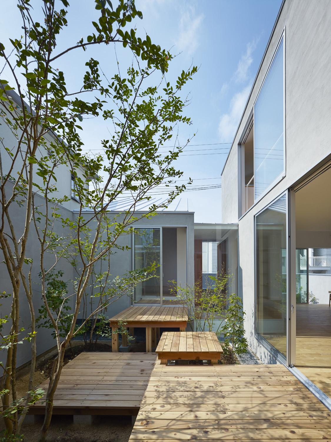 兵庫県の郊外(篠山市、丹波市)などでは、いまだ伝統的な民家が多く残り、中でも塀で敷地をやんわりと囲い、その中に母屋、離れ、倉庫(蔵)などが必要に応じて建築される形式が多くみられます。やんわりと領域を塀により囲いながら、棟間に生まれる庭などの外部空間により、各室はそれぞれ内庭に面し、安心して解放できるという単純ですがとても豊かな住空間です。本住宅は、敷地面積が限られ、込み入った市街地において、郊外の上記のような民家の持つ特性に着目することで、開放的でありながら、住居として守られた環境を生み出すことを目指しています。