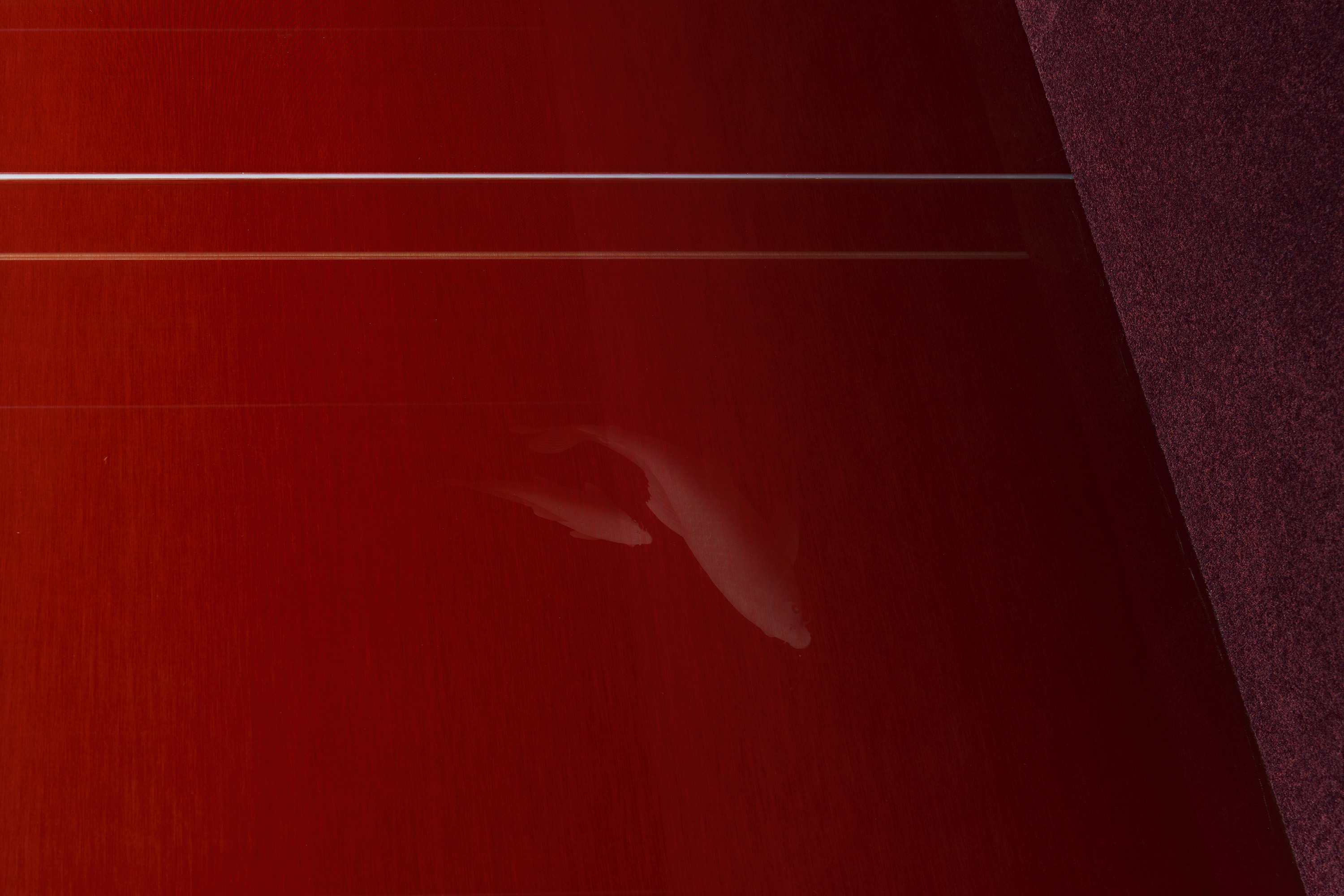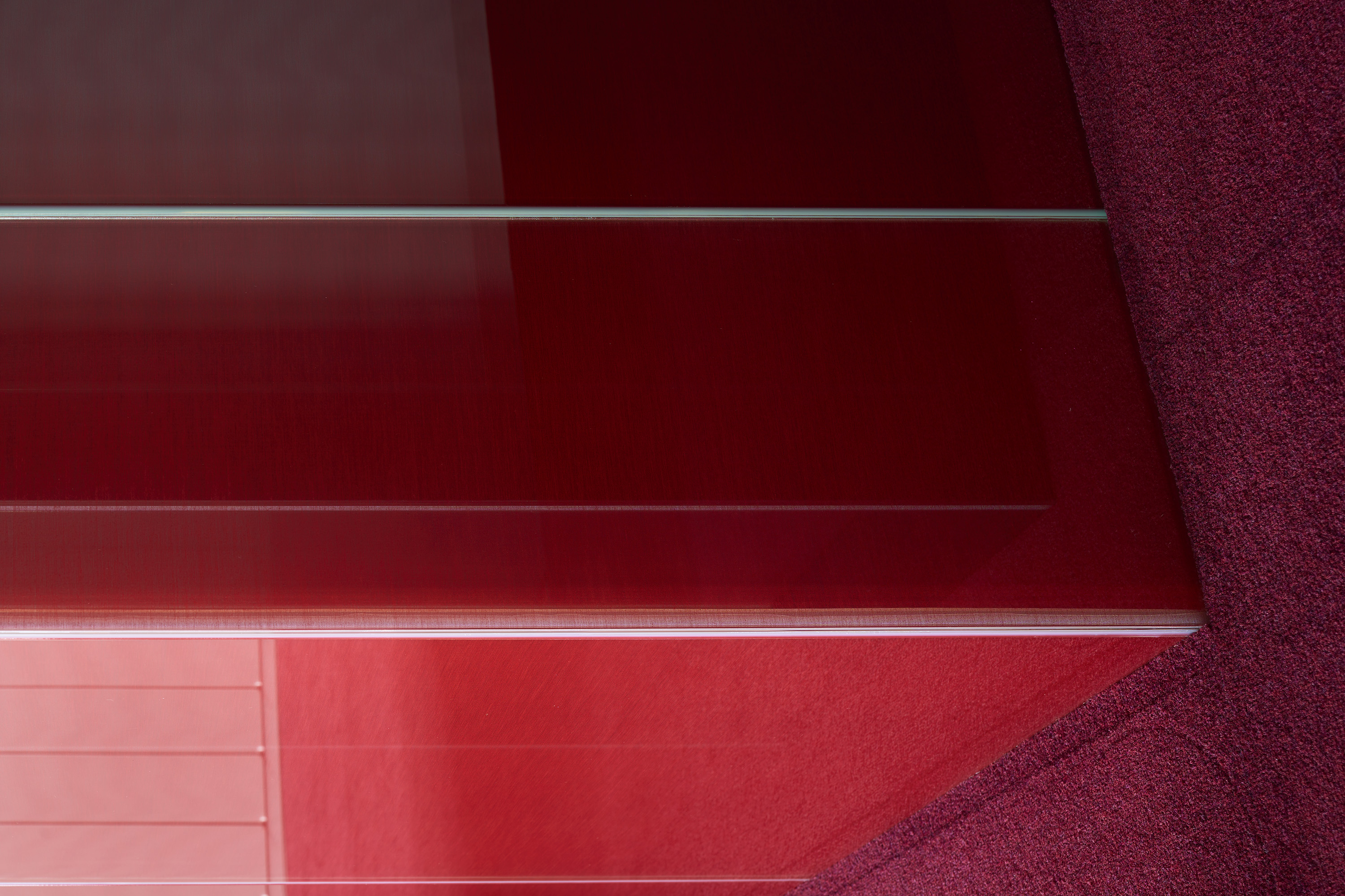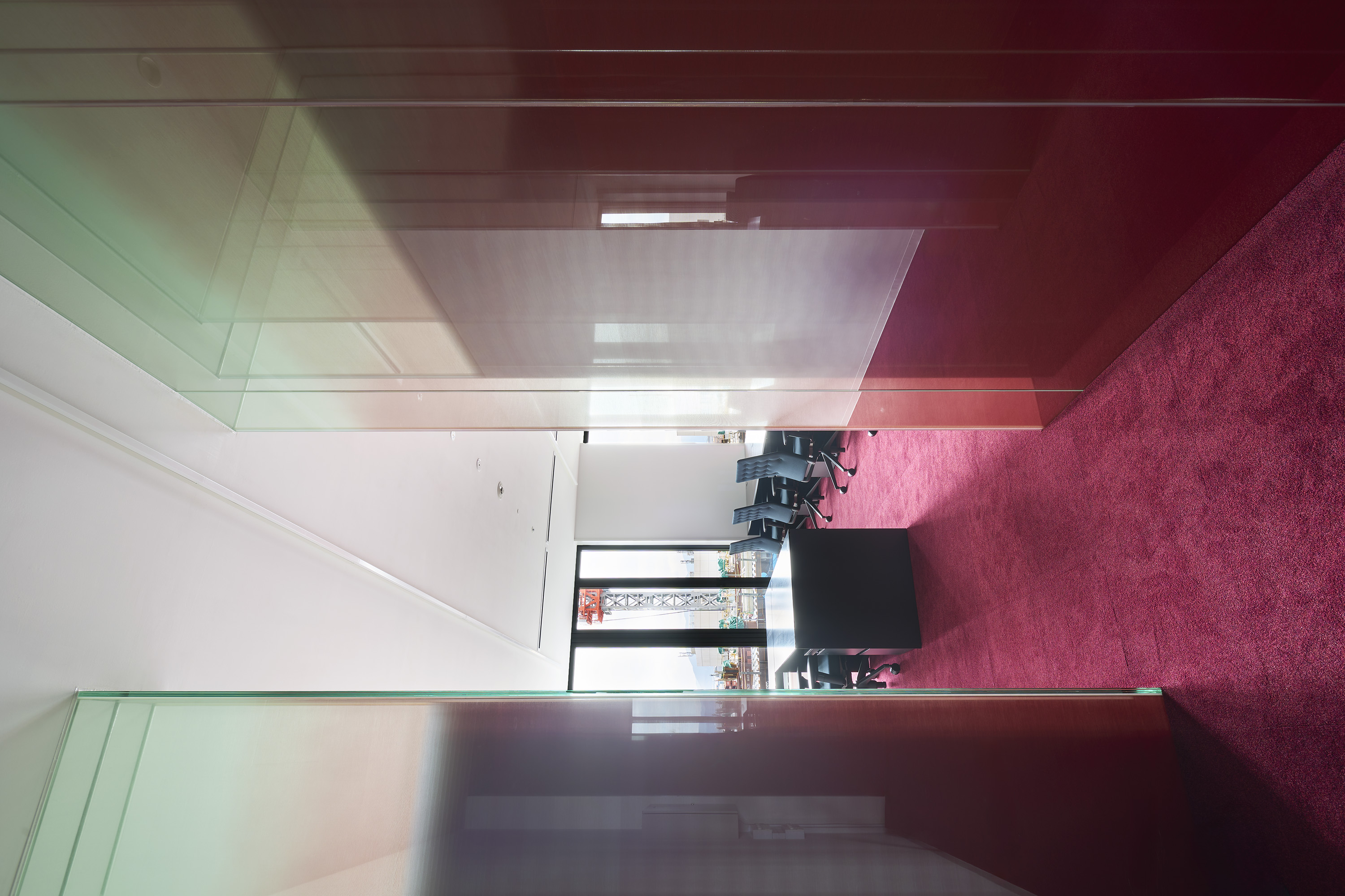 木綿は職人の手により天井に向かって少しずつ透過度が上昇し、上部では透き通るような透明度まで薄く織りあげられている。この漆を木綿をガラスに挟み込むことによって自立するスクリーンは、障子から欄間までをまるで連続的に織りあげたかのような新たな几帳となって現れた。