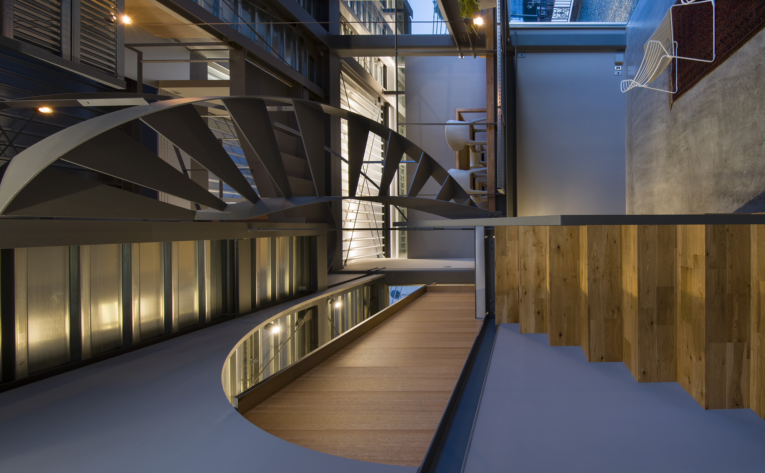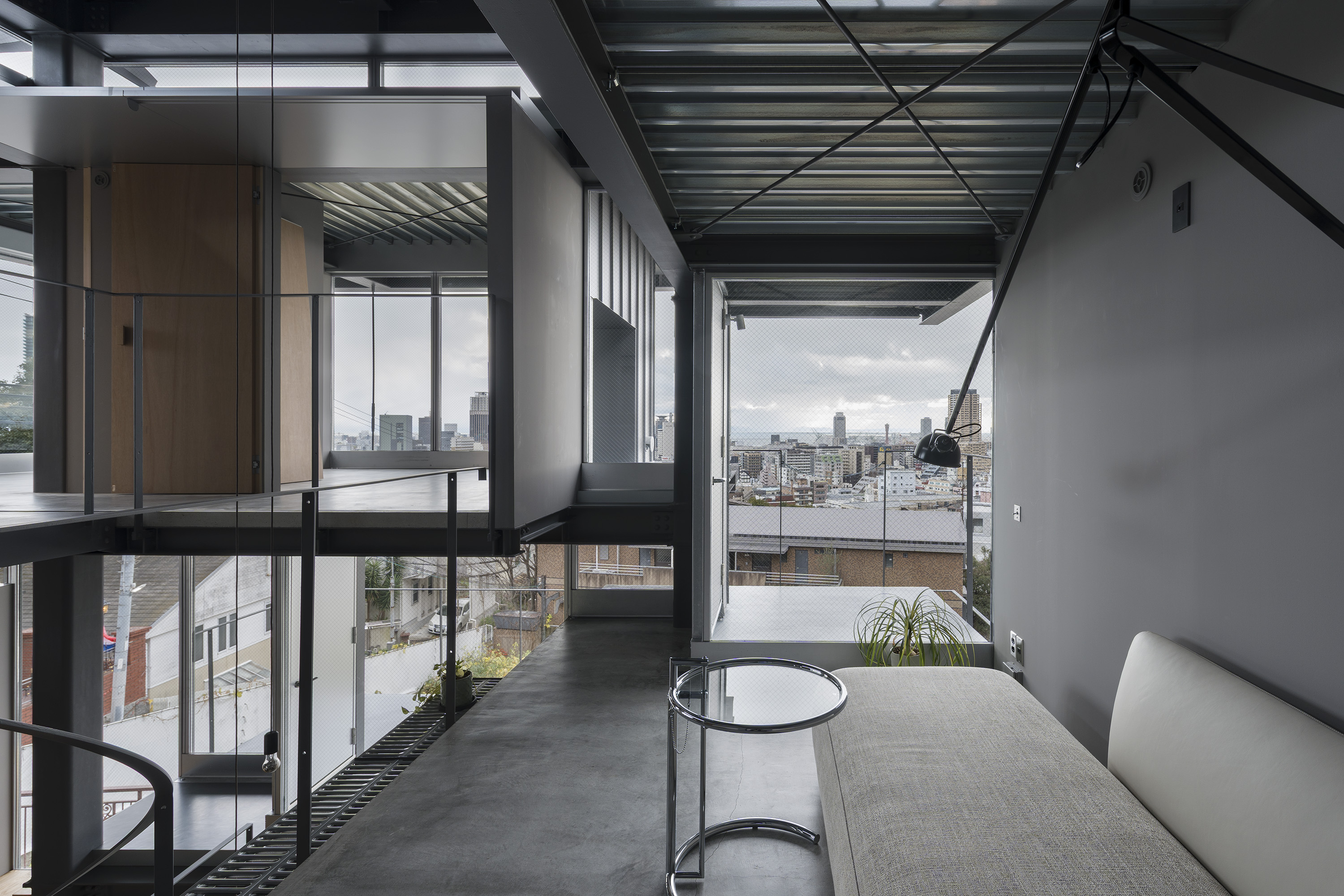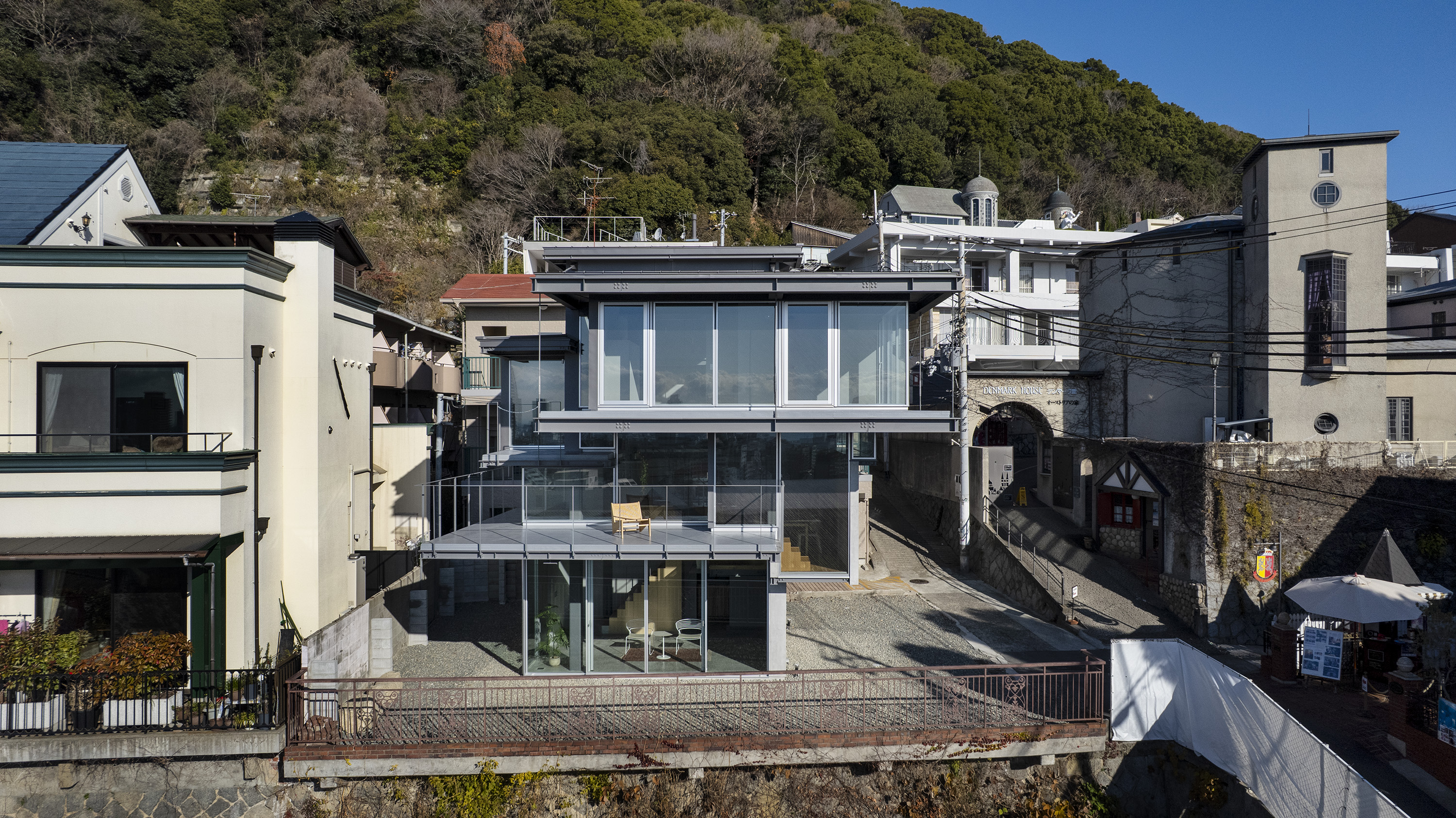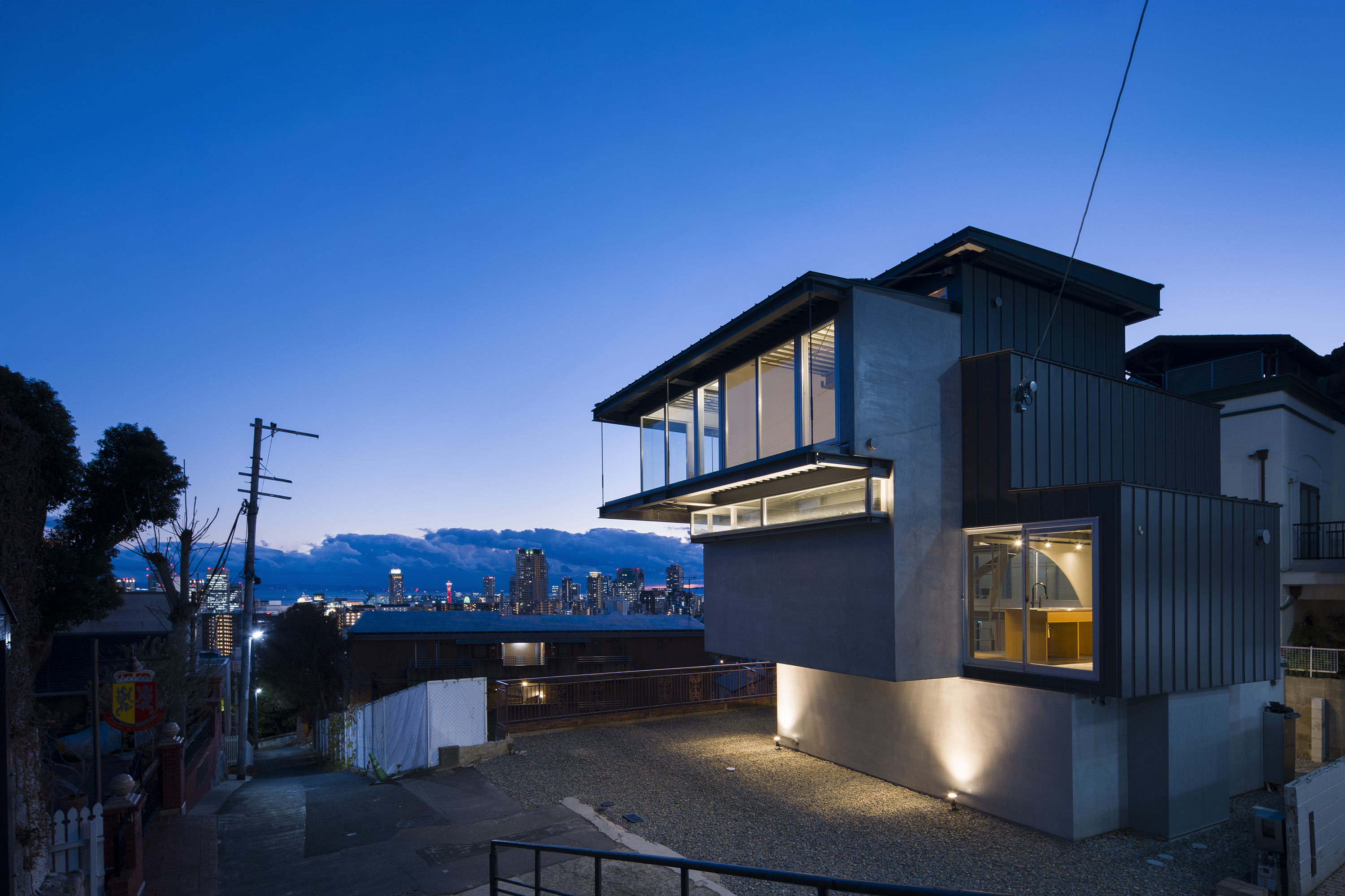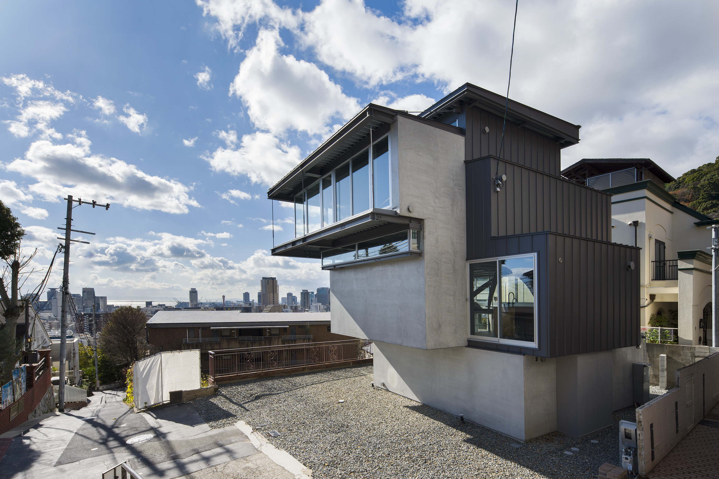 - 神戸の北野における住宅である。神戸では六甲山系の隆起で生まれた地形からなる坂の街が形成されてきた。このような地勢の街であるから、坂の街ならではの、山から海へ向けられた眼差しが街並みとなって受け継がれてきた。北野は神戸の山手に位置し、街をひと際広く望むことができる場所である。明治の開港以来、日本人と外国人が共に暮らす雑居地として発展してきたこの地では、街を望む眼差しは人種を超え、多様な人々の中で受け継がれ育まれてきた。そもそも「遥かに望む」という行為は人間の本能そのものであり、その本能に支えられた眼差しが地形と街の文脈に重なることで、固有の風景構造が形成されてきたのだと考えている。そこで私たちはこの風景構造がそのまま住まいとして立ち現れるような建築を考えた。そうすることで長い時間を生き続けてきた街と住まいが接続され、風景の中に住まいを拡張することができると考えたのである。