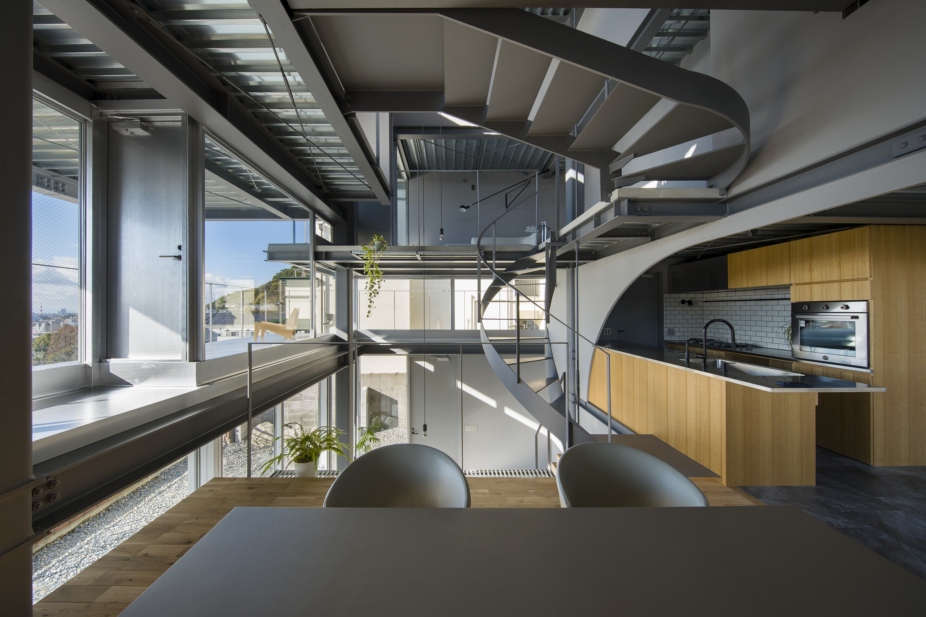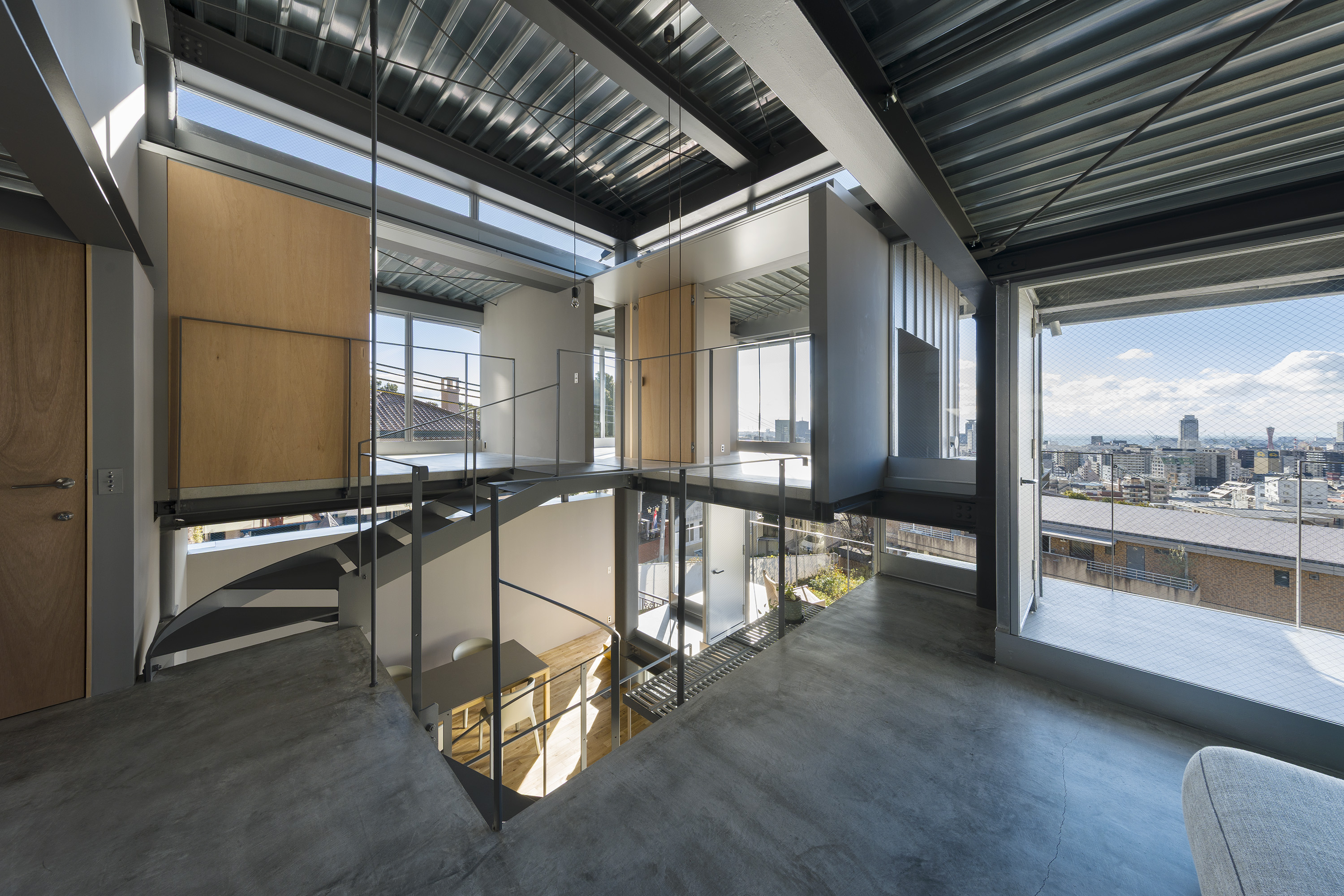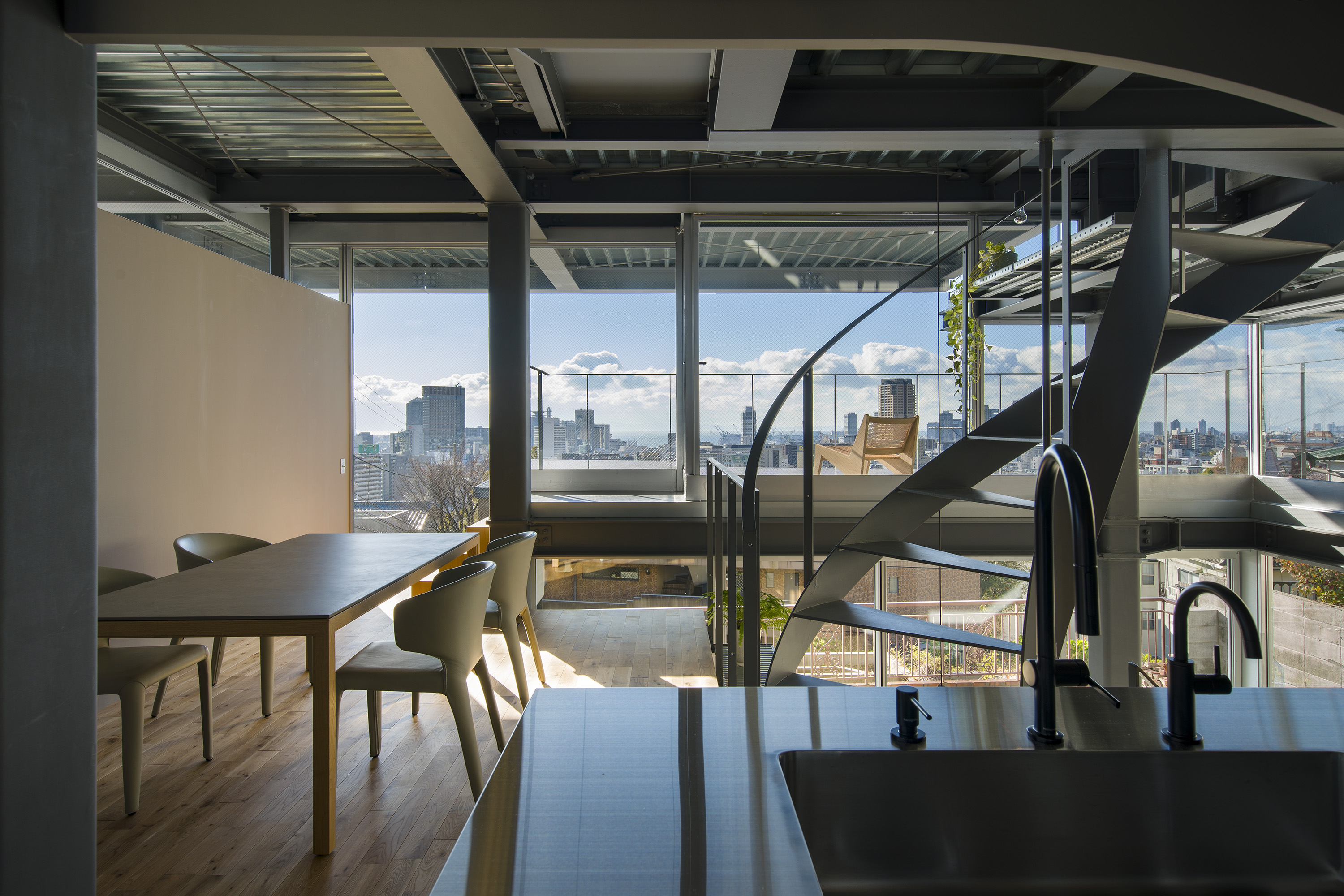 - This is a residence in Kitano, Kobe. Kobe has developed into a hilly town, created by the uplift of the Rokko Mountains. Due to this topography, the unique gaze from the mountains to the sea has been passed down as part of the town's streetscape. Kitano is located in Kobe's Yamate area, offering exceptionally wide views of the city. Since the port opened in the Meiji era, this area has developed into a mixed residential area where Japanese and foreigners live together, and this gaze looking out over the city has been passed down and nurtured among a diverse range of people, transcending race. The act of "looking far into the distance" is a human instinct, and we believe that the gaze supported by this instinct, combined with the topography and the context of the city, has led to the formation of a unique landscape structure. We therefore conceived an architecture in which this landscape structure emerges as a home. In doing so, we believed that the home would be connected to the city, which has existed for a long time, and that it would be possible to expand the home into the landscape. Specifically, in consideration of the conditions of being built on an artificial ground on a sloping site, the foundation footprint was kept compact like a tree trunk, and the floor that extends horizontally above it overhangs like a tree's branches spreading out generously from its trunk, creating a spacious home while minimizing the direct impact on the complex sloping site. This horizontally extending, branch-like floor is the very gaze towards the city, and by appropriately lifting it from the canopy-like roof with lumber like snow-hanging supports, a more free-flowing overhang is achieved. We imagine a life with a view of the city from a home like a tree with roots spreading out on the slope.