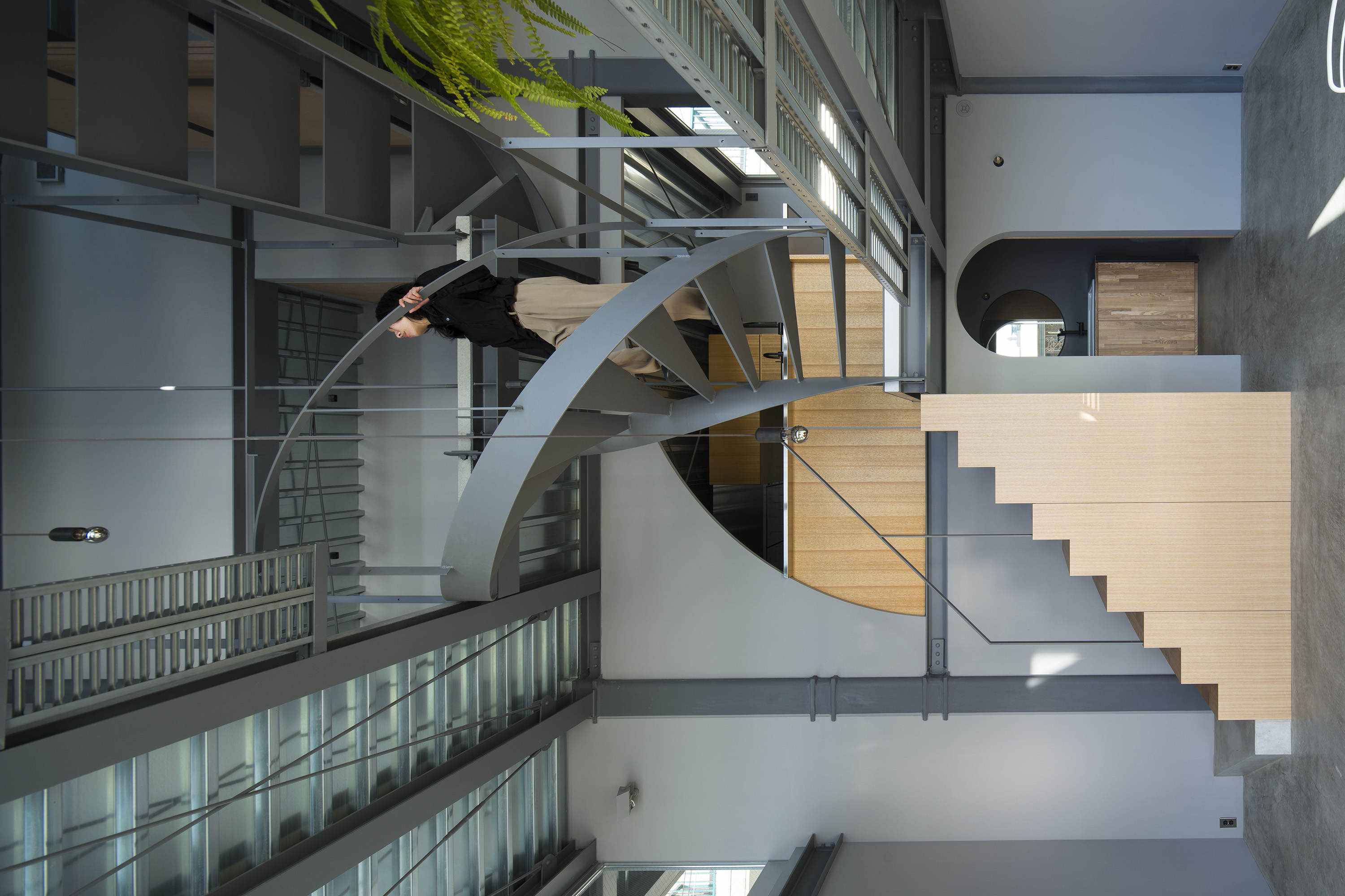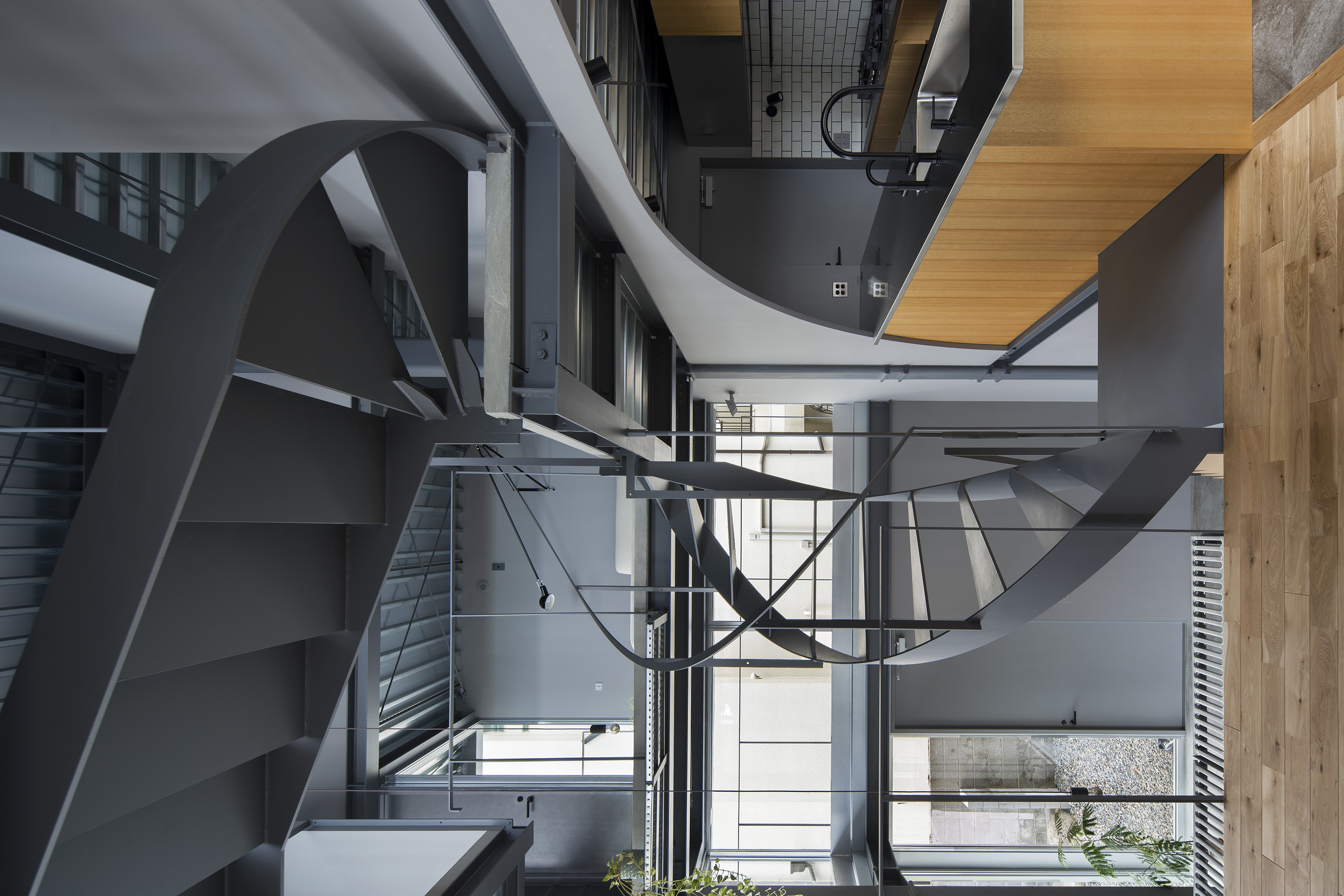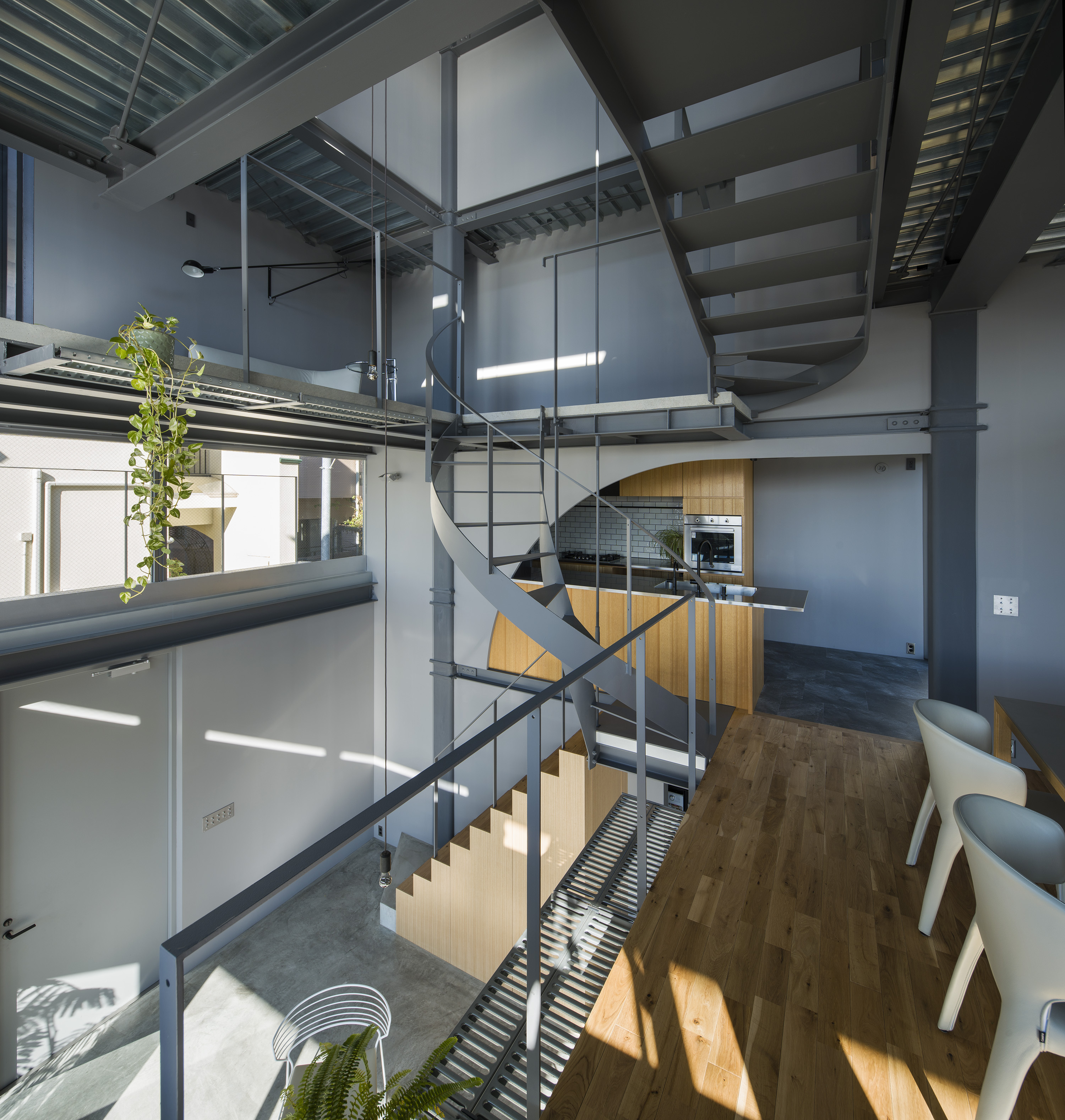 - This is a residence in Kitano, Kobe. Kobe has developed into a hilly town, created by the uplift of the Rokko Mountains. Due to this topography, the unique gaze from the mountains to the sea has been passed down as part of the town's streetscape. Kitano is located in Kobe's Yamate area, offering exceptionally wide views of the city. Since the port opened in the Meiji era, this area has developed into a mixed residential area where Japanese and foreigners live together, and this gaze looking out over the city has been passed down and nurtured among a diverse range of people, transcending race. The act of "looking far into the distance" is a human instinct, and we believe that the gaze supported by this instinct, combined with the topography and the context of the city, has led to the formation of a unique landscape structure. We therefore conceived an architecture in which this landscape structure emerges as a home. In doing so, we believed that the home would be connected to the city, which has existed for a long time, and that it would be possible to expand the home into the landscape. Specifically, in consideration of the conditions of being built on an artificial ground on a sloping site, the foundation footprint was kept compact like a tree trunk, and the floor that extends horizontally above it overhangs like a tree's branches spreading out generously from its trunk, creating a spacious home while minimizing the direct impact on the complex sloping site. This horizontally extending, branch-like floor is the very gaze towards the city, and by appropriately lifting it from the canopy-like roof with lumber like snow-hanging supports, a more free-flowing overhang is achieved. We imagine a life with a view of the city from a home like a tree with roots spreading out on the slope.
