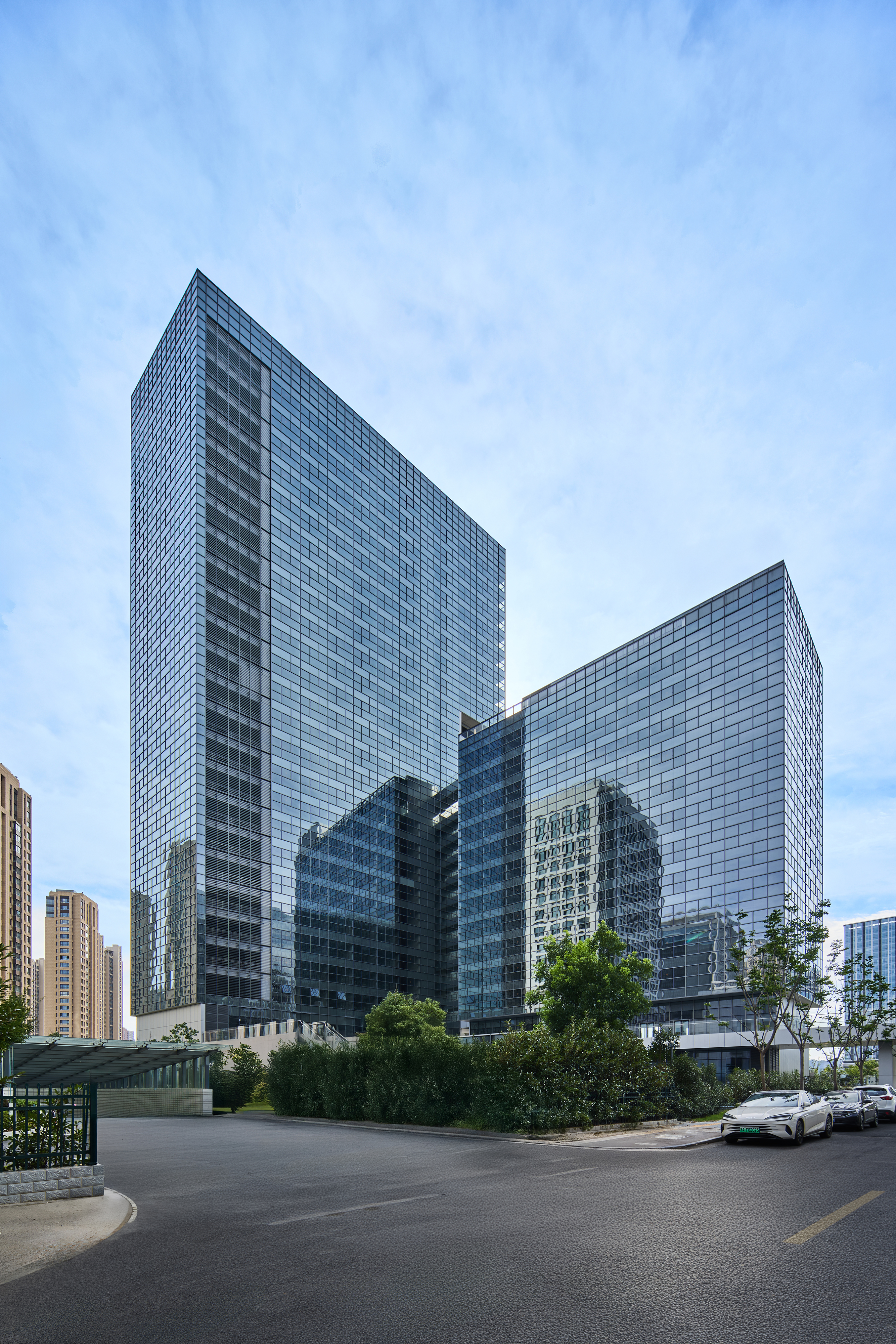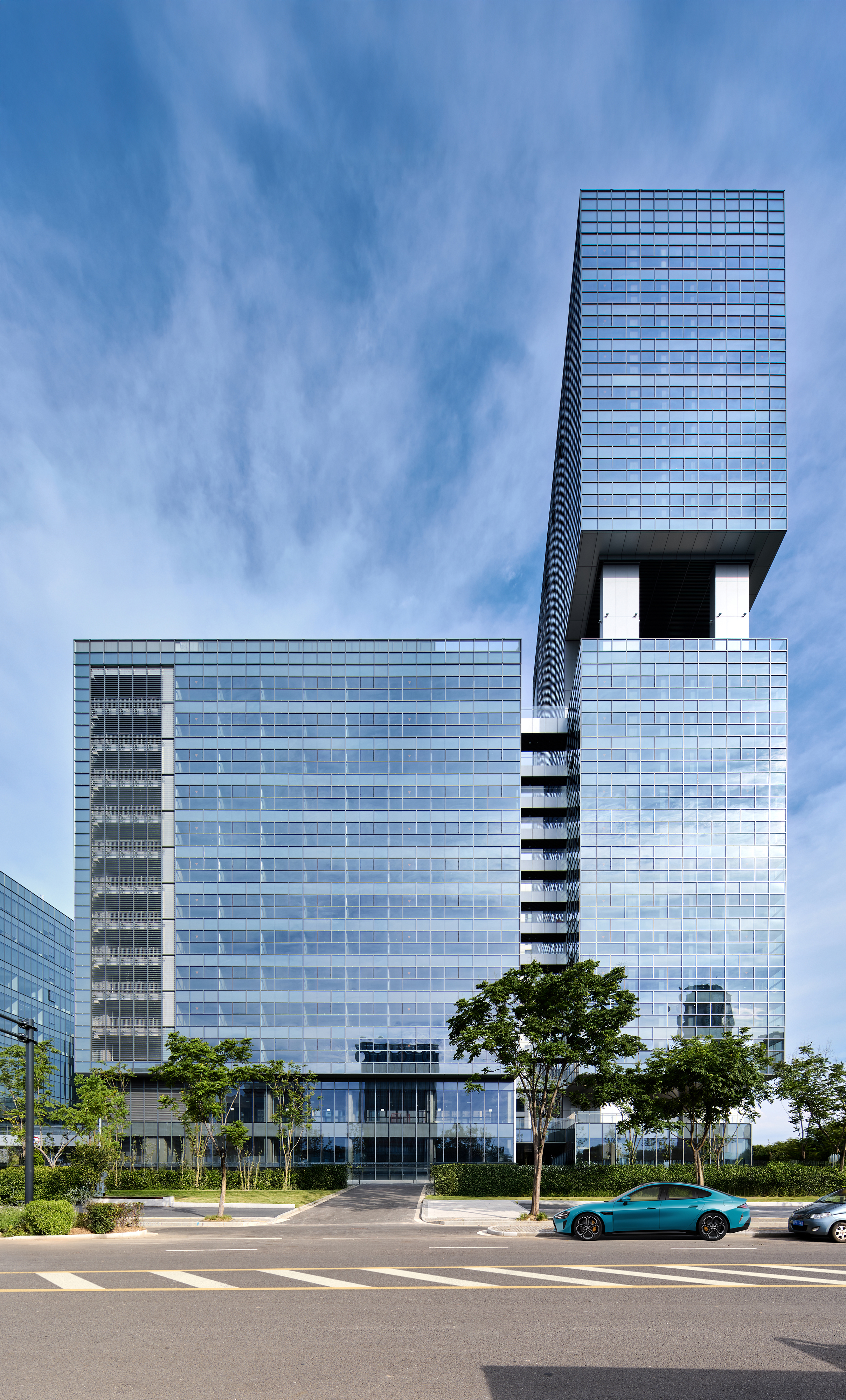 新都心の計画が進行中の南京市郊外。某社の南京本社ビル建設に際して行われた国際設計プロポーザルに、岸和郎+ケイ・アソシエイツ、長田直之(ICU)、キノアーキテクツとともに設計共同企業体として参加し、最優秀に選ばれた。オフィスと集合住宅の床面積を合計すると約30万㎡となる巨大なボリュームを3つの街区にまたがるコートハウス型の建築の連続として、街区内にパブリックスペースを内包し、それらをスパインとなる主動線で連続させる都市施設としての計画。弊社はC buildingの設計を担当。