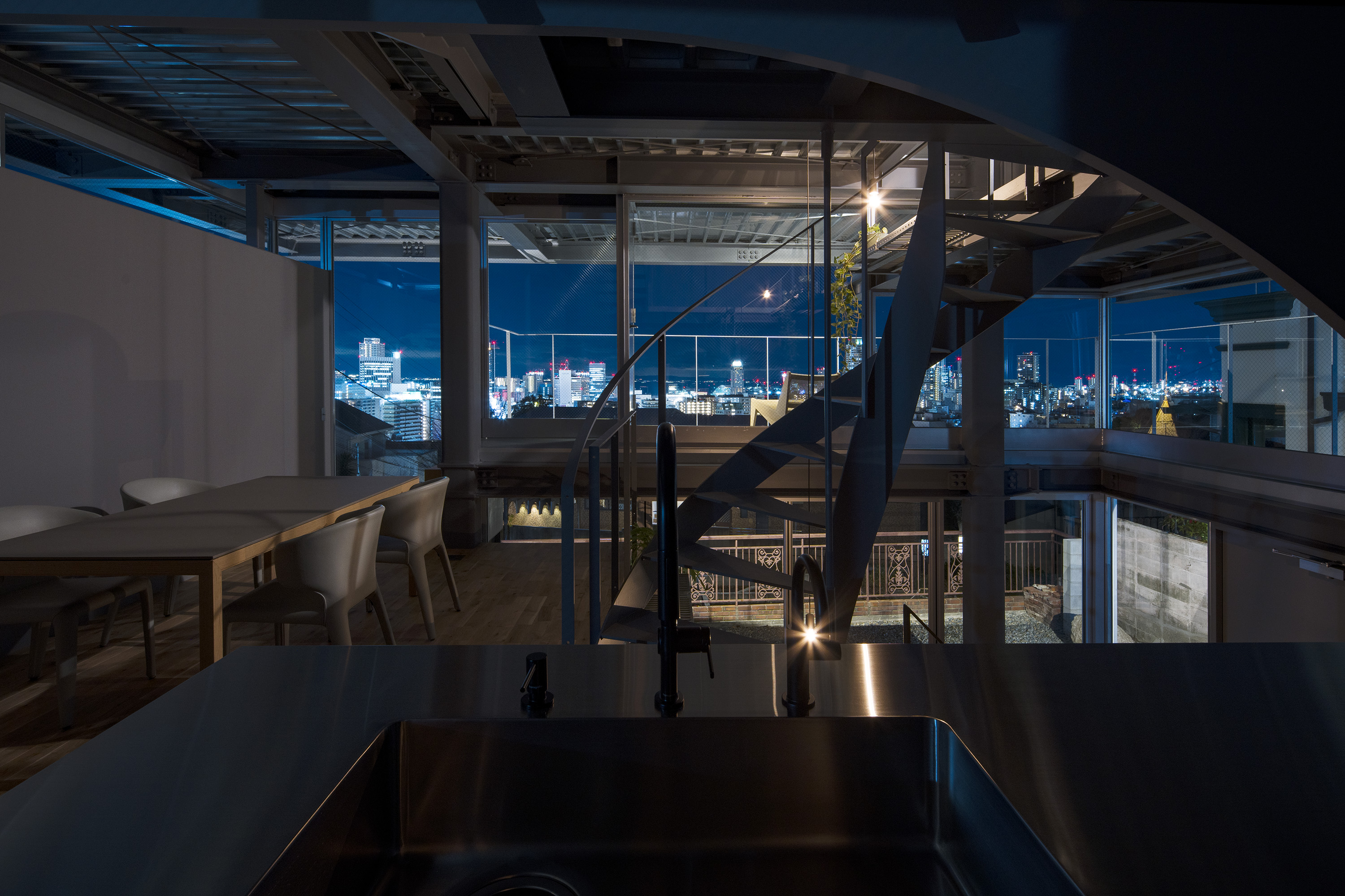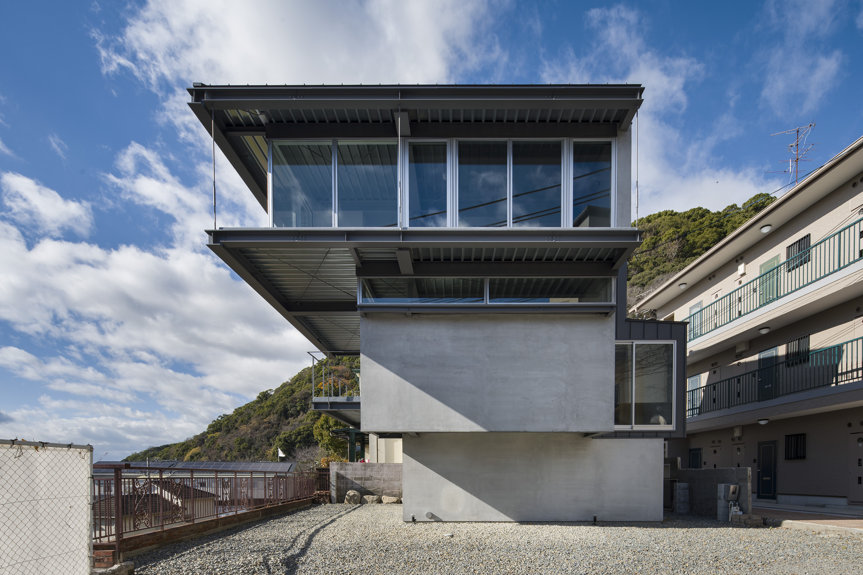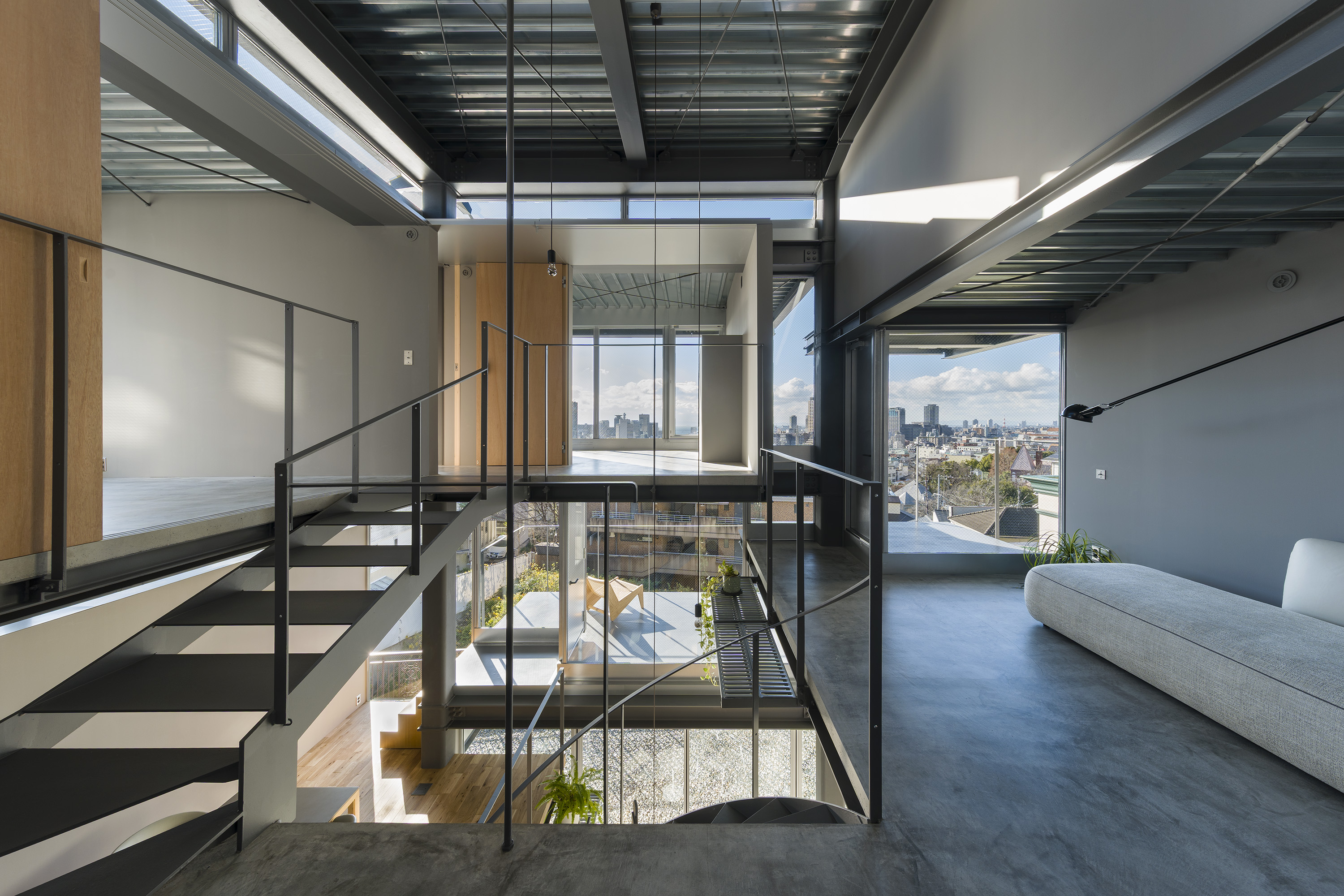 - This is a residence in Kitano, Kobe. Kobe has developed into a hilly town, created by the uplift of the Rokko Mountains. Due to this topography, the unique gaze from the mountains to the sea has been passed down as part of the town's streetscape. Kitano is located in Kobe's Yamate area, offering exceptionally wide views of the city. Since the port opened in the Meiji era, this area has developed into a mixed residential area where Japanese and foreigners live together, and this gaze looking out over the city has been passed down and nurtured among a diverse range of people, transcending race. The act of "looking far into the distance" is a human instinct, and we believe that the gaze supported by this instinct, combined with the topography and the context of the city, has led to the formation of a unique landscape structure. We therefore conceived an architecture in which this landscape structure emerges as a home. In doing so, we believed that the home would be connected to the city, which has existed for a long time, and that it would be possible to expand the home into the landscape. Specifically, in consideration of the conditions of being built on an artificial ground on a sloping site, the foundation footprint was kept compact like a tree trunk, and the floor that extends horizontally above it overhangs like a tree's branches spreading out generously from its trunk, creating a spacious home while minimizing the direct impact on the complex sloping site. This horizontally extending, branch-like floor is the very gaze towards the city, and by appropriately lifting it from the canopy-like roof with lumber like snow-hanging supports, a more free-flowing overhang is achieved. We imagine a life with a view of the city from a home like a tree with roots spreading out on the slope.