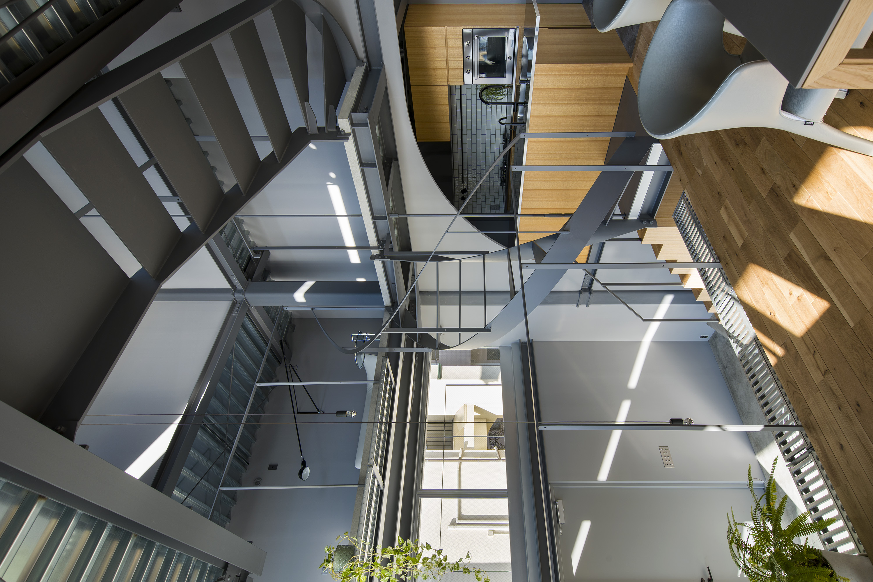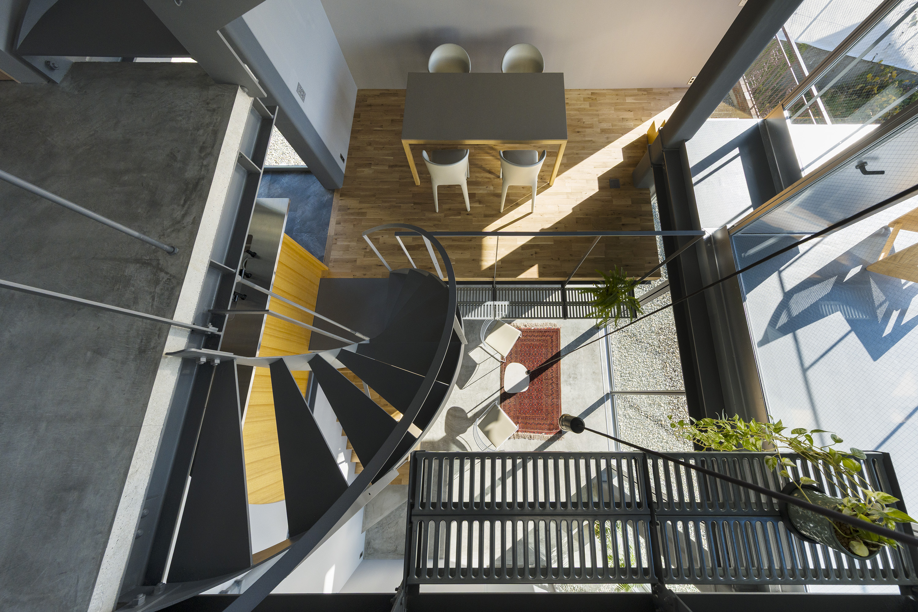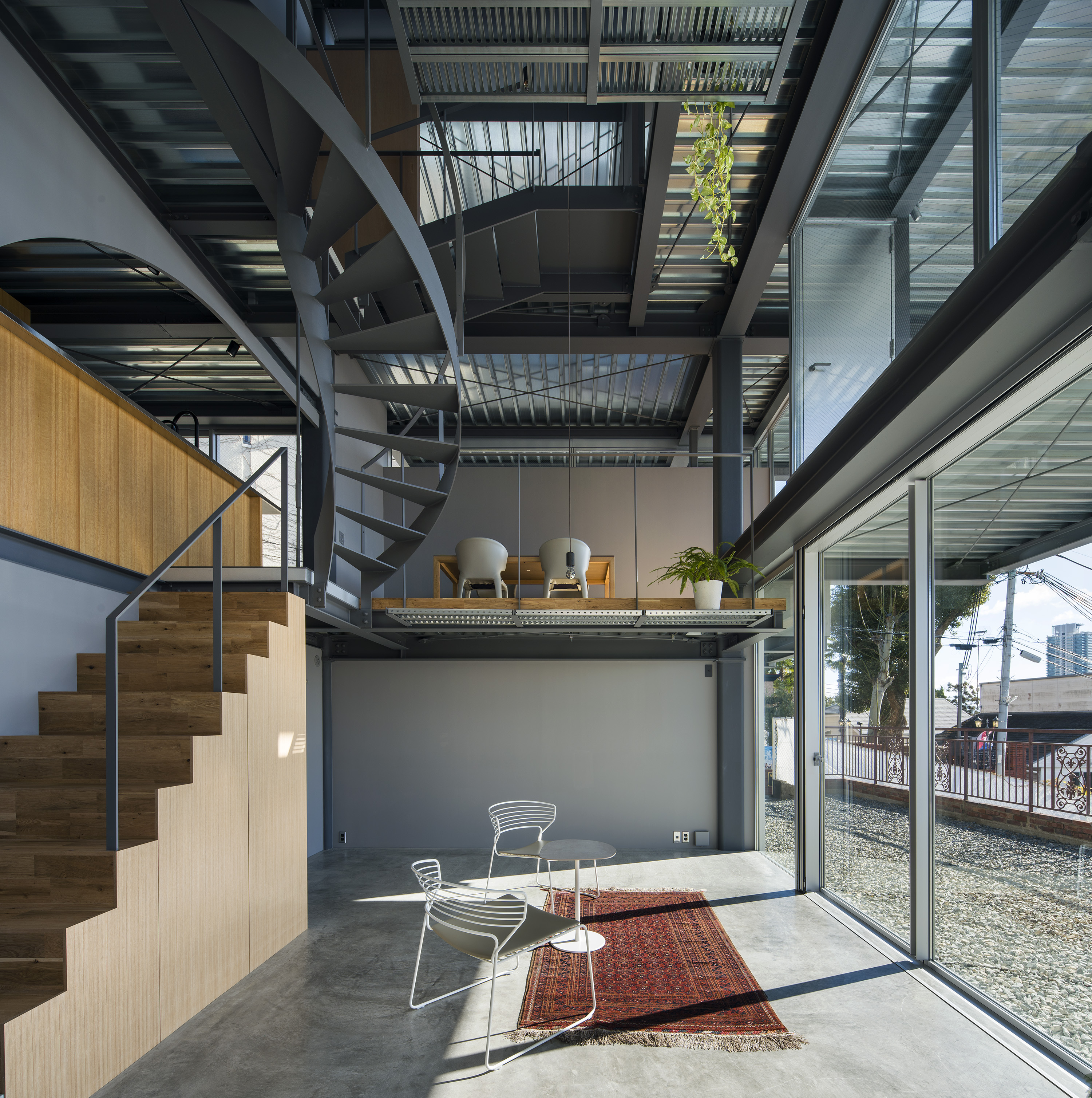- This is a residence in Kitano, Kobe. Kobe has developed into a hilly town, created by the uplift of the Rokko Mountains. Due to this topography, the unique gaze from the mountains to the sea has been passed down as part of the town's streetscape. Kitano is located in Kobe's Yamate area, offering exceptionally wide views of the city. Since the port opened in the Meiji era, this area has developed into a mixed residential area where Japanese and foreigners live together, and this gaze looking out over the city has been passed down and nurtured among a diverse range of people, transcending race. The act of "looking far into the distance" is a human instinct, and we believe that the gaze supported by this instinct, combined with the topography and the context of the city, has led to the formation of a unique landscape structure. We therefore conceived an architecture in which this landscape structure emerges as a home. In doing so, we believed that the home would be connected to the city, which has existed for a long time, and that it would be possible to expand the home into the landscape. Specifically, in consideration of the conditions of being built on an artificial ground on a sloping site, the foundation footprint was kept compact like a tree trunk, and the floor that extends horizontally above it overhangs like a tree's branches spreading out generously from its trunk, creating a spacious home while minimizing the direct impact on the complex sloping site. This horizontally extending, branch-like floor is the very gaze towards the city, and by appropriately lifting it from the canopy-like roof with lumber like snow-hanging supports, a more free-flowing overhang is achieved. We imagine a life with a view of the city from a home like a tree with roots spreading out on the slope.
