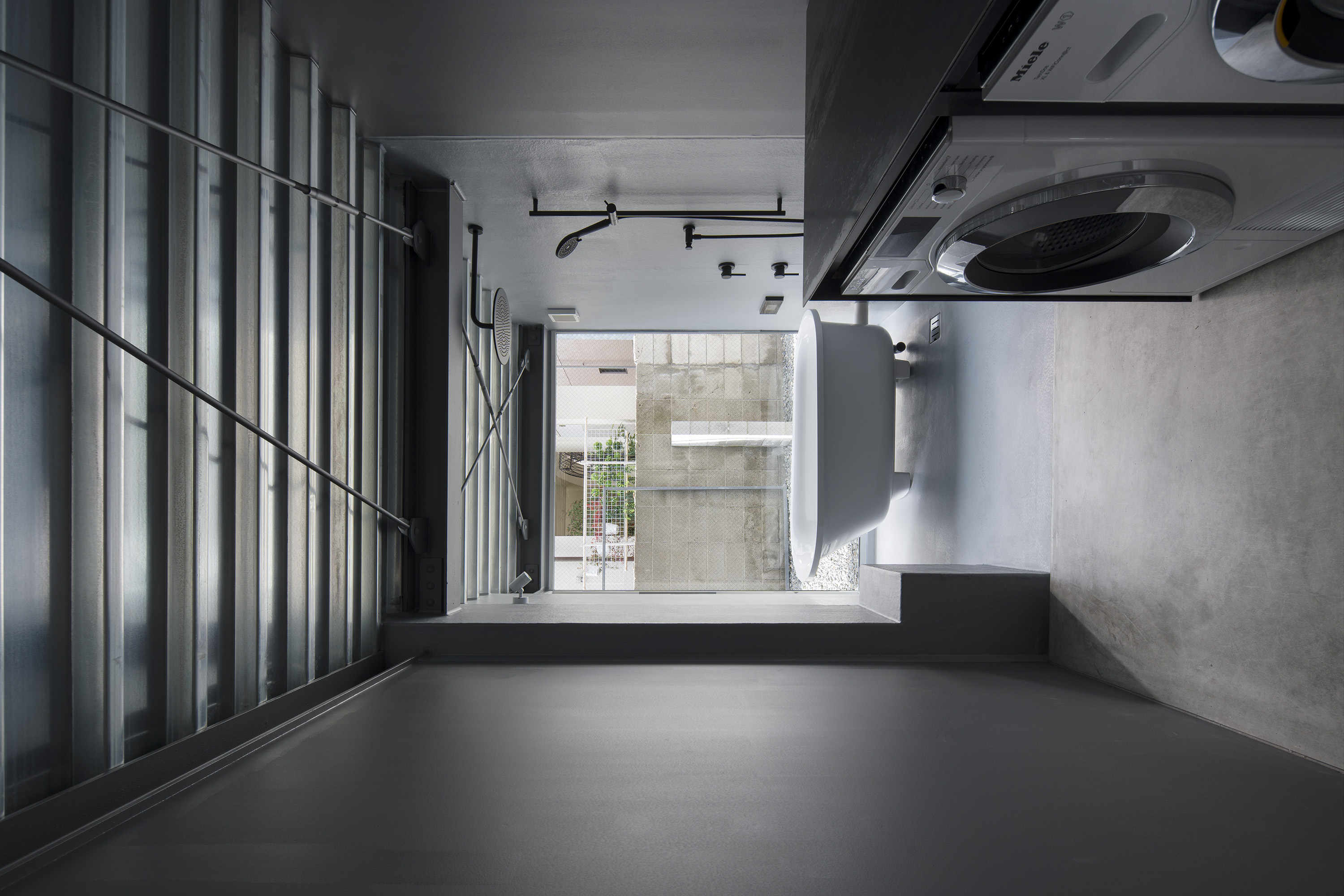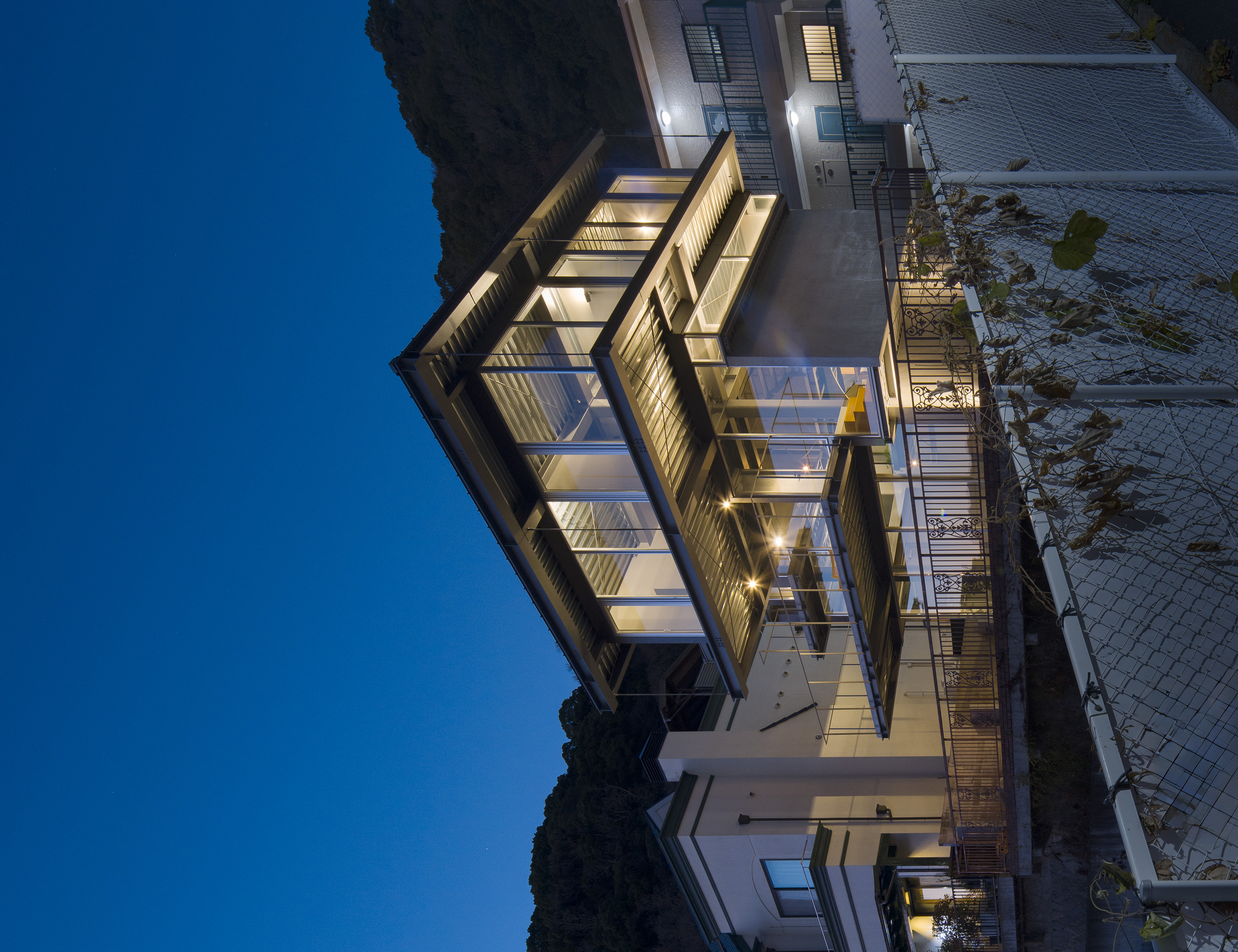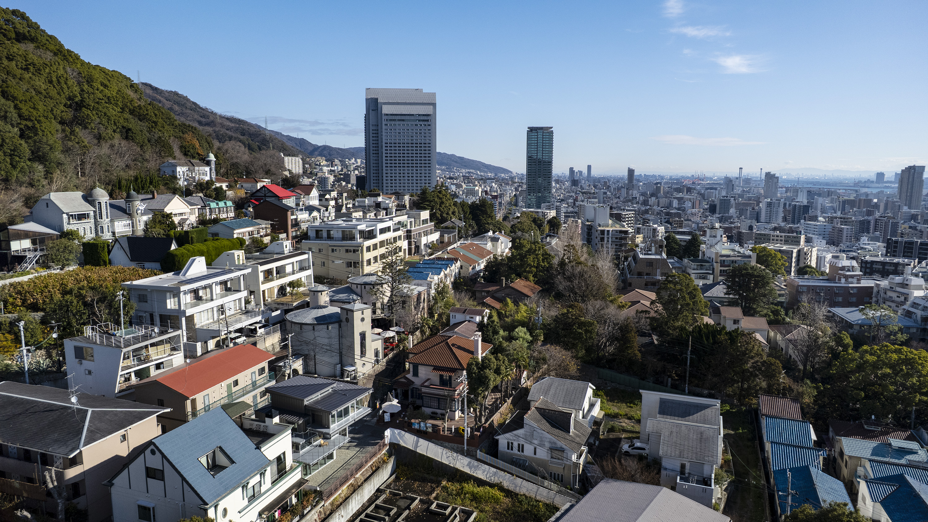 - 神戸の北野における住宅である。神戸では六甲山系の隆起で生まれた地形からなる坂の街が形成されてきた。このような地勢の街であるから、坂の街ならではの、山から海へ向けられた眼差しが街並みとなって受け継がれてきた。北野は神戸の山手に位置し、街をひと際広く望むことができる場所である。明治の開港以来、日本人と外国人が共に暮らす雑居地として発展してきたこの地では、街を望む眼差しは人種を超え、多様な人々の中で受け継がれ育まれてきた。そもそも「遥かに望む」という行為は人間の本能そのものであり、その本能に支えられた眼差しが地形と街の文脈に重なることで、固有の風景構造が形成されてきたのだと考えている。そこで私たちはこの風景構造がそのまま住まいとして立ち現れるような建築を考えた。そうすることで長い時間を生き続けてきた街と住まいが接続され、風景の中に住まいを拡張することができると考えたのである。